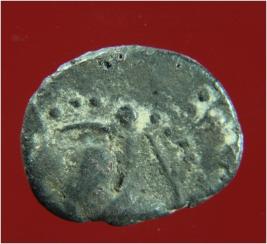 | Description / विवरण | Trench CZZ3-4, LxB-D 3.05 mts x 5.30 mts - 0.30 mts, B.peg CZZ1 8, Stratum-layer 2. It is a punch marked coin, made of copper. The surface of object is uneven. The colour of object is blackish. There are some dot like design on the peripheral area, one wheel like and linear design are in middle part of object. On other side there is a human figurine. It was used as currency. |