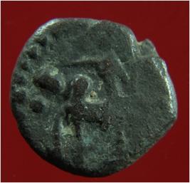 | Description / विवरण | Trench CZZ3-4, LxB-D 3.05 mts x 5.30 mts - 0.30 mts, B.peg CZZ1 8, Stratum-layer 2. It is a punch marked coin, made up copper. The surface of object is uneven. The colour of object is blackish. On one side of object a human is sitting over some animal, on other side ,dots like design on peripheral and wheel like and linear design in center. It was used as currency. |