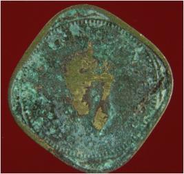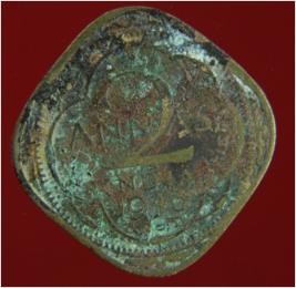| Description / विवरण | Trench Surface collection It s a copper coin, made up copper, Squarical shape, belonging to the period 1940 and having a face value of 2 Anna. |