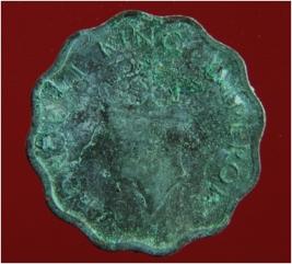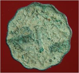 | Description / विवरण | Trench surface find. It is a coin made of copper. It has hard patina over it. It is an untreated coin. Its surface is rough and uneven. Its colour is green with black. |