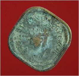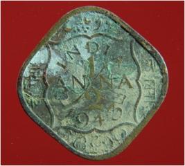 | Description / विवरण | Trench surface found. It is a square shape coin made of copper. It has soft patina over it. It is an untreated coin. Its dating is 1943 and costs a quarter Anna. Its surface is rough and uneven. Its colour is copper brown. |