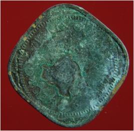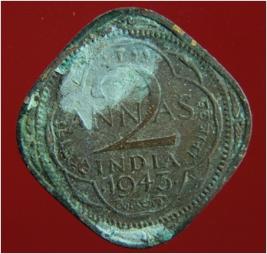 | Description / विवरण | Trench surface found. It is a square shape copper coin. It has hard patina over it. It is an untreated coin. Its value is two Anna. Its dating is 1946. Its surface is rough and uneven. Its colour is brown. |