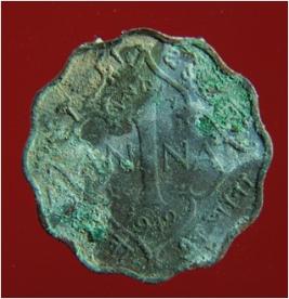 | Description / विवरण | Trench surface found. It is a copper coin. It has hard patina over it. It is an untreated coin. Its value is one Anna. Its surface is rough and uneven. Its colour is brown. |