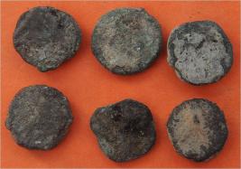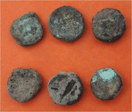 | Description / विवरण | Trench, Stratum-Surface find.. These are six copper coin. Almost of circular shape. Surface is uneven. Features are not visible due to deposition of dust and dirt. Common colour is dark grey. |