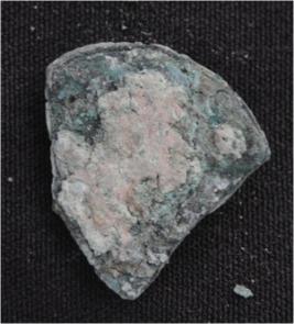 | Description / विवरण | Trench SGL-2 D II, Length-XIX1.67 to XXI1.55, Breadth- 0.50 to 1.45, Depth-3.85 to 4.20 MBS XVIII1,Stratum-pit 2 A. It is a quarter part of some coin like object, made of cooper. Surface of the object is uneven. Colour of the two object is greenish. Features are not visible due to presence of patina with dust and dirt. |