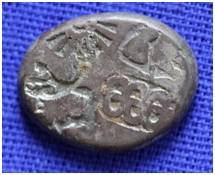 | Description / विवरण | The coin is an imperial type of Punch- marked coin. It is oval in shape. Obverse Sun, Caducius, Six armed wheel and other symbols are indistinct. Reverse Caducius. |