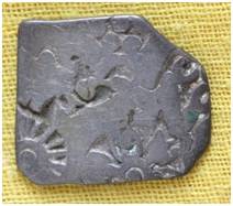 | Description / विवरण | The coin is an imperial type of Punch- marked coin. It is rectangular in shape. Obverse Sun, Six armed wheel, an animal stands on a five arched hill facing right, tree with branches, bull. Reverse Sun, spider and other symbols are not clear. |