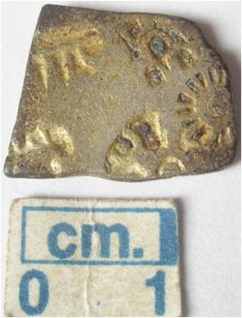 | Description / विवरण | A silver Gold punch marked coin, Rectangular Obverse has 5 symbols 1st Sun with rays, 2nd Hill symbol, 3rd Tree with branches,4th flying bird , 5th Taurine symbol. Reverse is plain. |