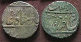 | Description / विवरण | Obverse- Muhammad shah 1274 badshah ghazi/ (sikkah mubarak) letter alif above the word badshah. Reverse- Bahadur/ manus julus/ 18 maimanat/ Fakhunda buniyad (Haiderabad) zarb. |