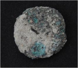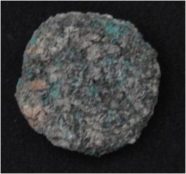 | Description / विवरण | Trench A, Length 3.10 m, Breadth 0.95 m, Depth 2.25 mbs at peg 1, Stratum Pit 1 sealed by layer 7 It is a copper coin. It has a disc like shape and rough surface. Features are not visible due to presence of patina. |
