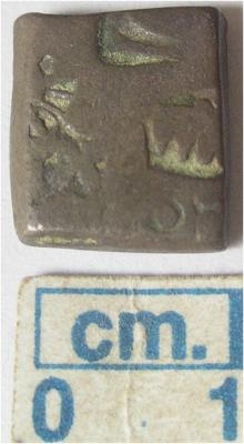 | Description / विवरण | A squares silver punch marked coin. Obverse has three symbols 1st Sun with four rays, 2nd Tree with branches, 3rd is not clear. Reverse is plain. |
