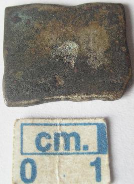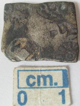 | Description / विवरण | A silver punch marked coin, Rectangular. Obverse One quarter sun symbol on one corner. Six armed symbol on other corner with only 1 3rd visible. Other symbol are not clearly visible. Reverse Rubbed plain surface. |