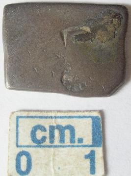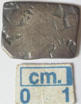 | Description / विवरण | Obverse has sun symbol on one corner and six armed symbol on other opposite corner. A taurine in pond. Other symbol is unidentifiable. Reverse Plain with some work. |