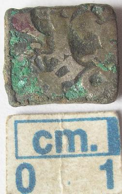 | Description / विवरण | A squarish silver punch marked coin. Obverse has four symbols 1st Taurine symbol, right to it, 2nd Six arm symbol above that, 3rd Hill symbol only two on top , 4th Upper left corner has sun symbol. Reverse is plain. |
