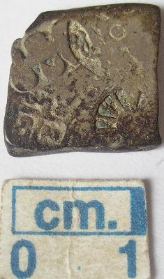 | Description / विवरण | A silver punch marked coin, Pentagonal Obverse 1st sun symbol, 2nd six arm symbol, 3rd caduceus symbol, 4th Taurine symbols in squares. Reverse has an unidentified symbol seen. |