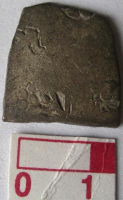 | Description / विवरण | A silver punch marked coin, Pentagonal in shape. Obverse 1st sun symbol, 2nd fish in circle 3rd Dog it may well be a jackal on a hill. 4th snake symbol 5th Unidentified symbol Reverse 1st flower symbol, 2nd tree with branches, 3rd Sun symbol, 4th flower symbol partly stamped 5th unidentified possibly an animal symbol. |