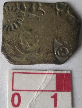| Description / विवरण | A silver punch marked coin, Heptagonal Obverse 1st Sun symbol, 2nd a rabbit in a crescent with taurine symbol which presumably represents the crescent moon and may be compared with the type on the coin of visnudeva 3rd Dumb-bell-shaped object in the arches See pp XXIV, Fig. 6 Allan , 4th Mountain symbol with multiple hills, 5th tree with branches Reverse Plain. |