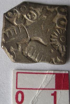| Description / विवरण | A silver punch marked coin, Hexagonal Obverse 1st an elephant symbol, 2nd sun symbol, 3rd Rabbit on mountain, 4th circle with a pallet in the center around the circle are six arm symbol with arrow head and taurine symbol in oval. 5th another elephant symbol Reverse Plain. |