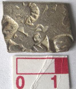 | Description / विवरण | A silver punch marked coin, Rectangular Obverse 1st sun symbol, 2nd tree with branches Partly 3rd six arm symbol with arrowhead and taurine, 4th an elephant may be another animal symbol partly stamped Reverse is plain. |