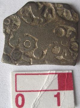 | Description / विवरण | A silver punch marked coin, Hexagonal Obverse 1st Bull Nandi of shiva symbol. 2nd an animal on hill, 3rd six arm symbol with arrow head and taurine, 4th an animal symbol probably an elephant 5th sun symbol Reverse 1st Sun symbol, 2nd sun symbol 3rd unidentified symbol. |