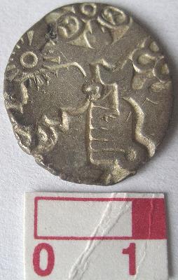 | Description / विवरण | A silver punch marked coin, round in shape. Obverse 1st sun symbol, 2nd bull nandi of shiva symbol, 3rd elephant symbol, 4th mountain symbol, 5th six arm symbol with arrowhead and taurine. Reverse a small circle stamped on circumference of coin. |
