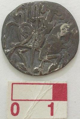 | Description / विवरण | A silver coin of Samantdeva, Rounded Shahi-Samanta Deva Obverse crude representation of king in armour, on caparisoned horse, to right; symbol. Reverse Recumbent humped bull, to left, with trapping with curved sides on rump; legend above-Sri-Samantadeva Reference 1. Studies in Indian Coin by D.C. Sircar pp 385 XVII 6 2. The Pre-Mohammedan coinage of Northern India, XIV-I 3. Smith, I.M.C. XXVI.3 |