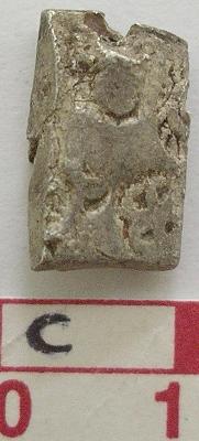 | Description / विवरण | A silver punch marked coin, Rectangular Obverse Caduceus symbol, sun symbol, six arm symbol with taurine Reverse is unfinished and channel like. |