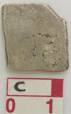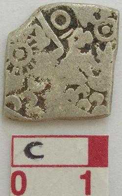 | Description / विवरण | A silver punch marked coin, Pentagonal Obverse sun symbol, hill symbol with crescent, hill symbol with peacock, six arm symbol with arrowhead and taurine, Steelyard symbol. Reverse Probably tree in railing |