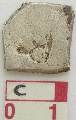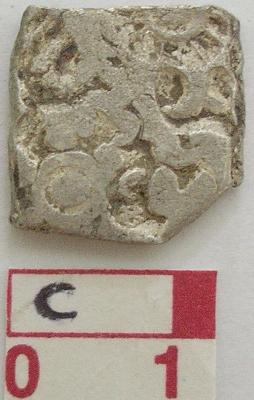 | Description / विवरण | A silver punch marked coin, Pentagonal Obverse Sun symbol, an animal elephant symbol, six arm symbol with taurine, taurine symbol. Reverse Hill symbol |