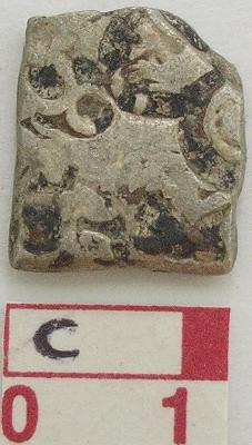 | Description / विवरण | A silver punch marked coin, Pentagonal Obverse Sun symbol, An animal symbol may be an elephant , hill symbol with crescent on top, Six arm symbol with arrowhead and taurine, not clear but may be pattets surrounded by four semicircles see pp. XXXVIII. 13. J. Allan. Reverse has dumb-bell symbol on the top of hill Hill symbol with crescent on top. |