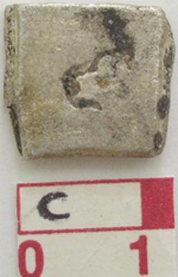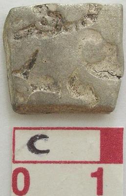| Description / विवरण | A silver punch marked coin, square Obverse Sun symbol, Hill symbol with crescent on top, flower with petells short stamped , six arm symbol with arrowhead. Reverse has hill symbol |