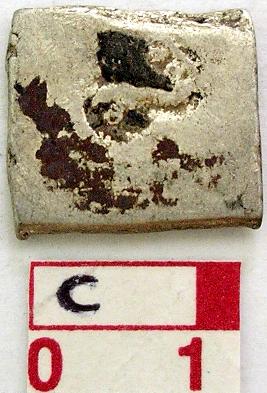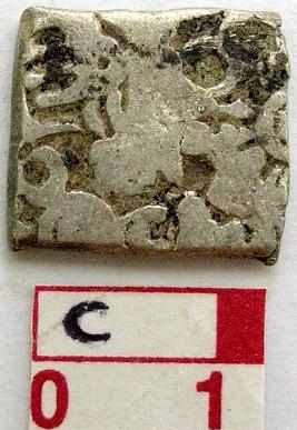 | Description / विवरण | A silver punch marked coin, square shape Obverse six arm with taurine symbol, taurine symbol, an elephant symbol, six arm symbol with taurine and arrowhead. Reverse Not clear but may be crescent on the top of hill symbol. |