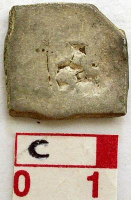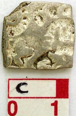 | Description / विवरण | A silver punch marked coin, square shaped Obverse Sun symbol, flower with petals , six arm symbol with arrowhead and taurine, An elephant symbol, Hill symbol with crescent on top. Reverse has hill symbol with crescent on top. |