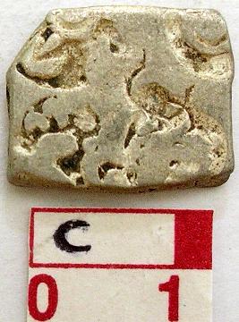 | Description / विवरण | A silver punch marked coin, Rectangular Obverse Sun symbol, six arm symbol with arrowhead and taurine, tree with branches or flower with pattels, an elephant symbol . Reverse has hill symbol with crescent on top. |