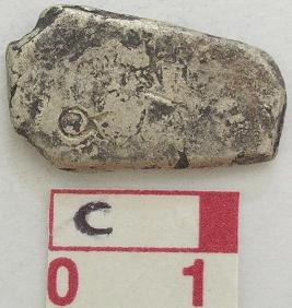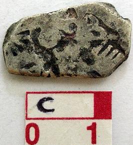 | Description / विवरण | A silver punch marked coin, petal shaped Obverse Sun symbol, six arm symbol with arrowhead short stamped and only a small arrow seen , fish symbol in the river , an elephant symbol, probably a hill symbol , six arm symbol with taurine. Reverse has a taurine symbol. |