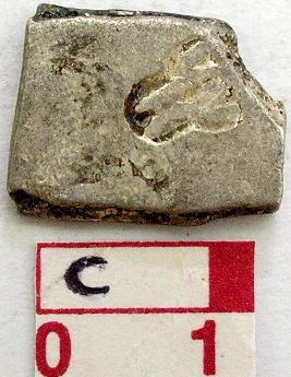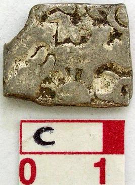 | Description / विवरण | A silver punch marked coin, Pentagonal Obverse Sun symbol, taurine symbol, six arm symbol with arrowhead and taurine, unidentified, fish or scorpion symbol . Reverse has hill symbol with crescent on top. |