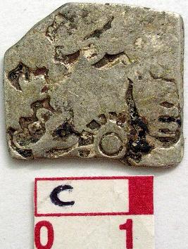 | Description / विवरण | A silver punch marked coin, Pentagonal Obverse Sun symbol, an elephant symbol, hill symbol with crescent on top, six arm symbol with arrowhead and taurine, a rabbit or dog or jackal like animal. Reverse has two symbols 1st Hill symbol with crescent on top, 2nd Shadarchakra with curved rays and taurine or dumb-bell like symbol seen in between two rays. |