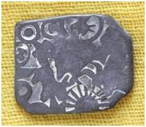 | Description / विवरण | The coin is an imperial type of Punch- marked coin. It is rectangular in shape. Obverse Sun, three arrows and three taurines around a circle with a conspicuous dot, a hare facing right stands over the five arched hill, animal and other symbols are not clear. Reverse Tree and other symbols are not clear. |