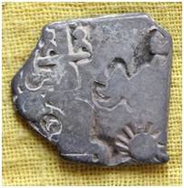 | Description / विवरण | The coin is an imperial type of Punch- marked coin. It is irregular in shape. Obverse Sun, Six armed wheel, a standing human figure flanked by two taurines, a bull facing right stands over five arched hill. Reverse Sun. |
