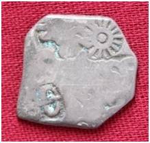 | Description / विवरण | The shape of the coin is irregular. This is an imperial type of punch marked coin. Obverse Sun, caduceus, hump bull, six armed symbol, three arched hill. Reverse Animal. |