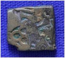 | Description / विवरण | The shape of the coin is Square. This is an imperial type of punch marked coin. Obverse Three arched hill, crescent on the top, Sun, six armed symbol. Reverse Six armed symbol. |