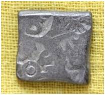 | Description / विवरण | The shape of the coin is square. Obverse Sun, six armed symbol, bird, three arched gate. Reverse Blank. |