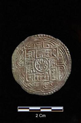 | Description / विवरण | Obverse Legend is squire having sun, moon, star and other ornaments outside, and around ornamental trident inside a circle in the centre - Sri Sri Sri Rajender Vikram Shah Dev below 1802. Reverse Legend written in eight potable lotus Sri Bhawani around dagger at four sides on the pericap , and Sri Sri Sri Gorakhnath one syllable each on eight petals . |