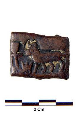 | Description / विवरण | Obverse- Standing figure of wolf before a Jayadhvaja and fire altar. Reverse- Plain. |