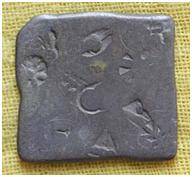 | Description / विवरण | The coin is an imperial type Punch- marked Coin. The shape of the coin is rectangular. Obverse Sun, six armed chakra, dog, an elephant and bull. Reverse Chakra, tree, musroom, taurine, flower and other two symbols are indistinct. |