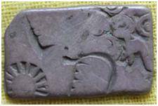 | Description / विवरण | The coin is an imperial type Punch- marked Coin. The shape of the coin is rectangular. Obverse Sun, two animals, six armed chakra. Reverse Tree and other symbols are indistinct. |