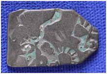 | Description / विवरण | The shape of the coin is Hexagonal. Obverse Sun, fish, six armed chakra, two Taurine acircular dot, animal, human figure flanked by two Taurine. Reverse Taurine, Crescent, square box and symbols are indistinct. |