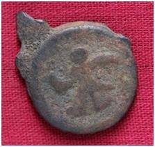 | Description / विवरण | The shape of the coin is circular. Obverse- Kushana type King, standing with his right arm curved upward and left arm extended. Reverse- probably the figure of MAO or Moon God- with his left arm down word and the crescent above the left shoulder. |