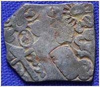 | Description / विवरण | The coin is an imperial type Punch- marked coin. The shape of the coin is hexagonal. Obverse Sun, elephant, six armed wheel, human figure flanked by four taurines and one indistinct symbol. Reverse A chakra and two indistinct symbols. |