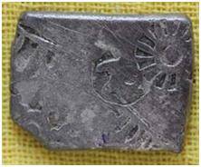 | Description / विवरण | The shape of the coin is pentagonal. Obverse Sun, deer, three arched gate, six armed wheel and an indistinct symbol. Reverse An indistinct symbol. |
